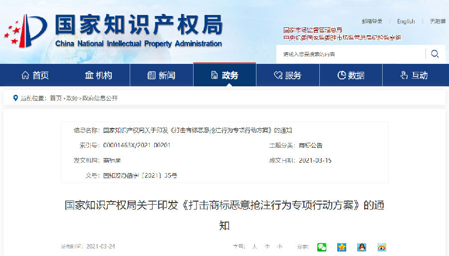 为深入贯彻习近平总书记在中央政治局第二十五次集体学习时的重要讲话精神,认真落实全国知识产权局局长会议部署,进一步加大对商标恶意抢注行为打击力度,依据《中华人民共和国商标法》《中华人民共和国商标法实施条例》《规范商标申请注册行为若干规定》,决定自2021年3月起,集中开展打击商标恶意抢注行为专项行动。