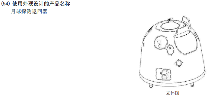 除了一系列发明专利外,“月球探测返回器”也已申请外观技术专利,申请人为北京空间飞行器总体设计部。