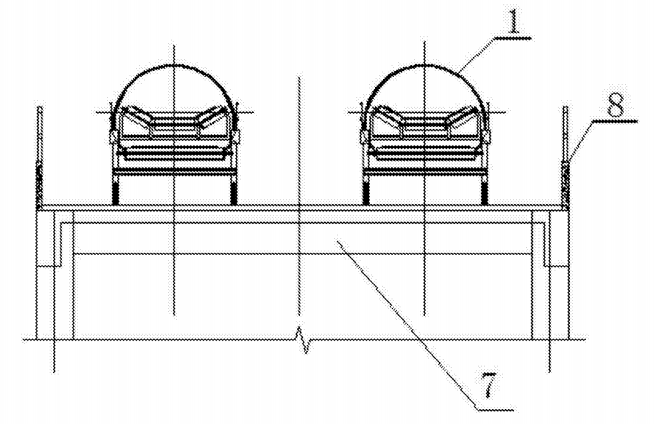 (1)所述防护罩包括罩体、第一挡板及第二挡板,所述罩体固定于所述输送机,所述第一挡板及所述第二挡板枢接于所述罩体两侧壁、并且分别位于所述输送机两侧,所述第一挡板的自由端与所述第二挡板的自由端之间的距离不小于所述隔离墙靠近污水区的两侧壁之间的距离;所述第一挡板的自由端、所述第二挡板的自由端均抵持于所述隔离墙顶部;