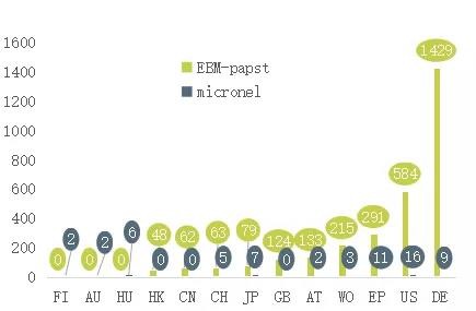 从左侧图可知,无扩展同族专利数为1019项,有扩展同族的扩展专利族为662项,占比39%。通常,有扩展同族的母专利原创性高,会在多个国家布局同族专利,也会针对母专利技术进行延续性创新,并产出新的同族子专利申请。