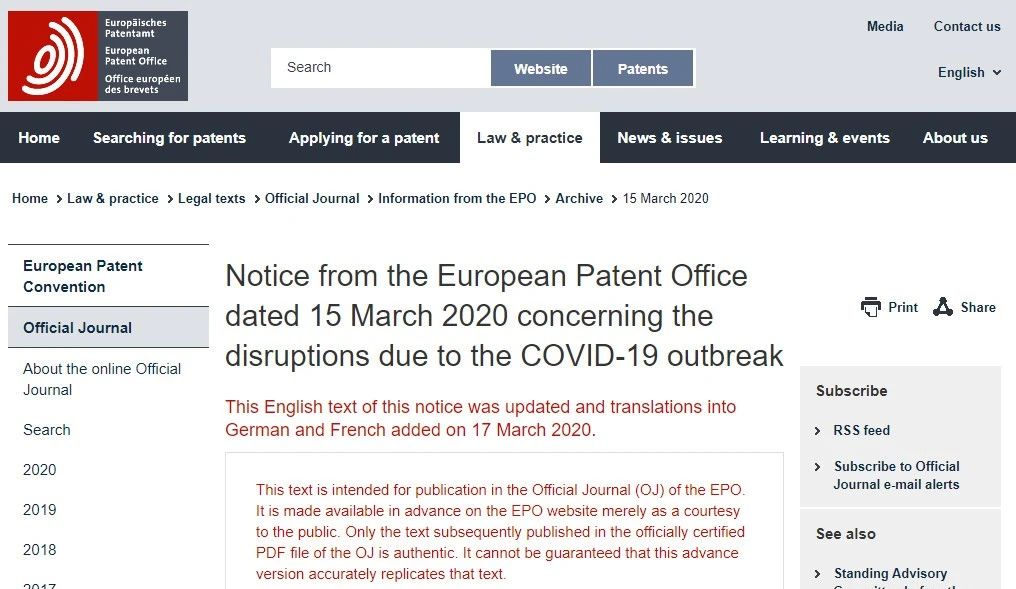 EPO:延长疫情严重地区申请人欧洲专利案件的时限