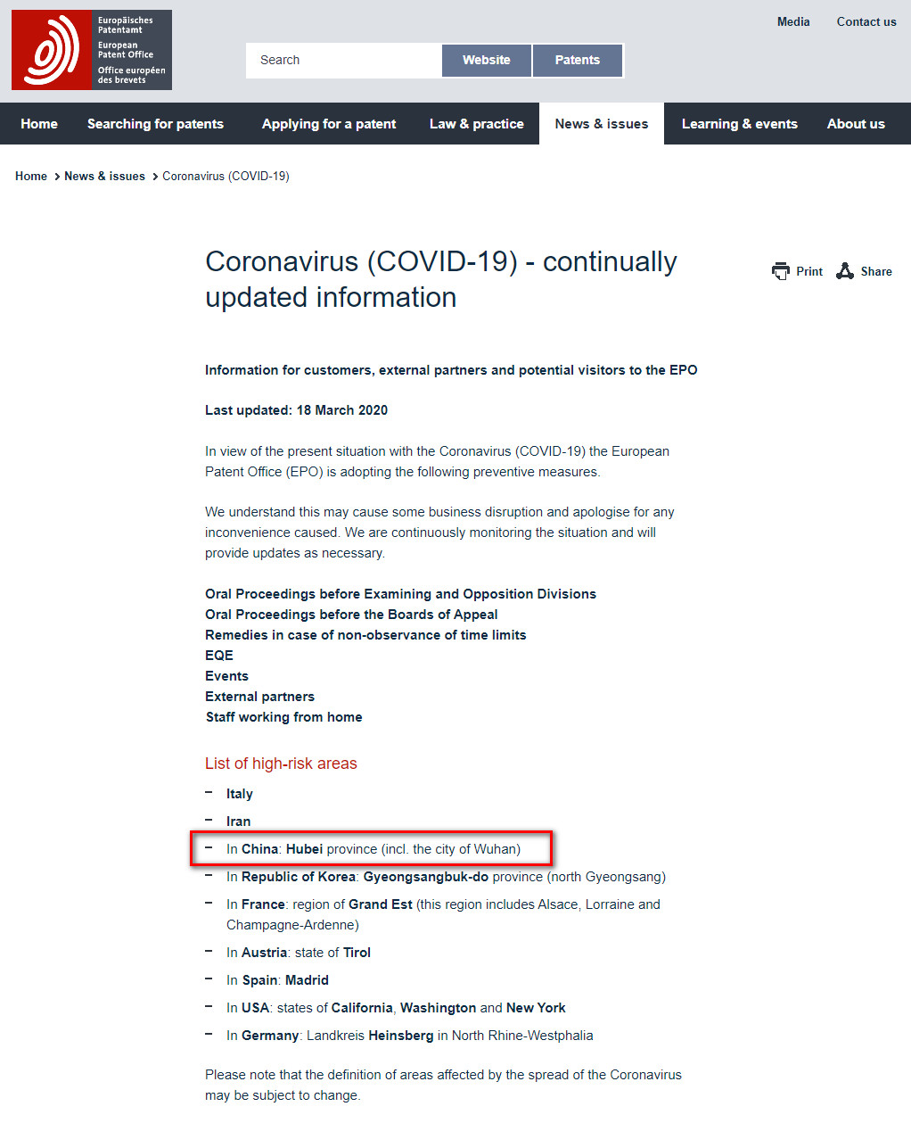 该通知内容主要涉及疫情严重地区申请人根据《欧洲专利公约》(EPC)以及《专利合作条约》(PCT)所申请的案件。其中,根据EPC细则第134条第(2)款和第150条第(2)款的规定,自通知发布当日及之后过期的时限,其有效期延长至2020年4月17日。此外,根据PCT细则82之四.1款,时限延误在一定条件下可予以宽免。中国申请人可根据该通知,做好案件相关调整安排和工作准备。 1.鉴于新冠肺炎疫情暴发的影响所引起的问题,在时限延误的情况下,请关注《欧洲专利公约》(EPC)和《专利合作条约》(PCT)所规定的一般法律救济措施,特别是根据本通知的EPC细则第134条第(2)款的适用,以及EPC细则第134条第(5)款和PCT细则第82条之四.1款的可能适用。 2.与许多其他缔约国一样,欧洲专利局所在地的德意志联邦共和国正在经受人员流动、社交以及某些服务、交流和公众日常生活的限制,符合EPC细则第134条第(2)款中定义的不可抗拒事由。因此,为所有当事人及其代表将本通知即日起的有效期延长至2020年4月17日。根据EPC第150条第(2)款,这也适用于按照PCT提出的国际申请。如果不可抗拒事由持续至上述日期后,则将发布另一条通知从而进一步延长上述有效期。 3.在与本通知第2段不冲突的情况下,对于本通知未涵盖的情况,EPC细则第134条第(5)款为异常状况所导致的申请人、当事人或其代表的居住地或者营业地无法正常投递或者传输邮件的情况提供了保障。此规定适用于申请人不可控的异常状况所导致的时限延误的情况,因此,在受疫情影响的地区[1],任何遭受干扰影响的申请人、诉讼当事人或其代表均可援引。 4.根据EPC细则第134条第(5)款的规定,如果相关人员可以提供证据表明,在期限届满日前十天内的任一天由于此异常状况而导致时限延误,并且最迟在不可抗拒事由结束后的第五天完成邮寄或传送,那么误期收到的文件应视为已经按期收到。 5. 在与本通知第2段不冲突的情况下,有关PCT适用的期限和条件,请参见PCT细则82之四.1款。特别是,任何相关当事人可以提交令人信服的证明,其未能遵守PCT的时限是由于在其居住地、营业地或者逗留地发生的自然灾害或其他类似原因造成的,并且已经在合理限度内尽快办理了相关手续(不迟于有关期限届满后6个月),则时限的延误应予以宽免。该规定适用于在国际阶段待审的国际申请,但不适用于优先权期限。 截至3月17日,高危地区名单已更新如下: 中国,韩国,伊朗,意大利,德国(北莱茵-威斯特法伦州的海因斯贝格),法国(大东区),奥地利(蒂罗尔州),西班牙(马德里),美国(加利福尼亚州、华盛顿州及纽约州)。请注意,受新冠肺炎疫情影响的区域定义可能会发生变化,请访问欧洲专利局网站进行定期更新。
