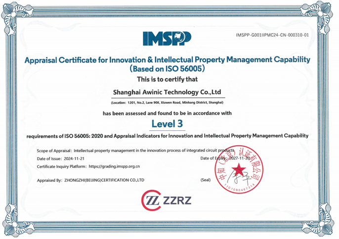 ISO56005《创新与知识产权管理能力》国际标准,旨在帮助企业建立和完善创新与知识产权管理体系,提升企业的核心竞争力。三级等级证书的获得,意味着艾为电子在创新战略规划、创新过程管理、知识产权创造、运用、保护和管理等方面均达到了国际先进水平,为公司的可持续发展奠定了坚实的基础。